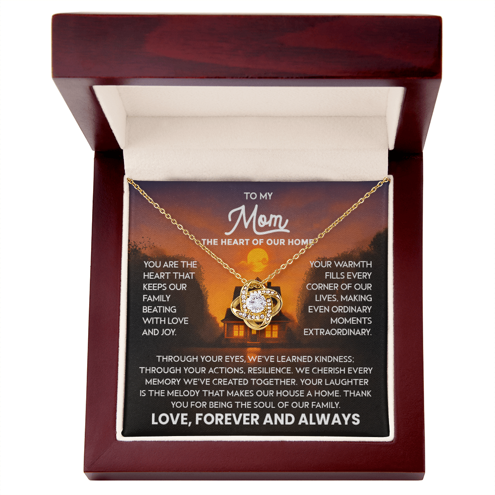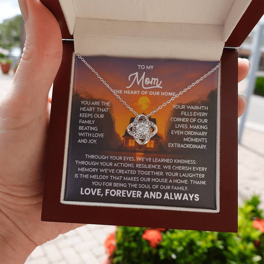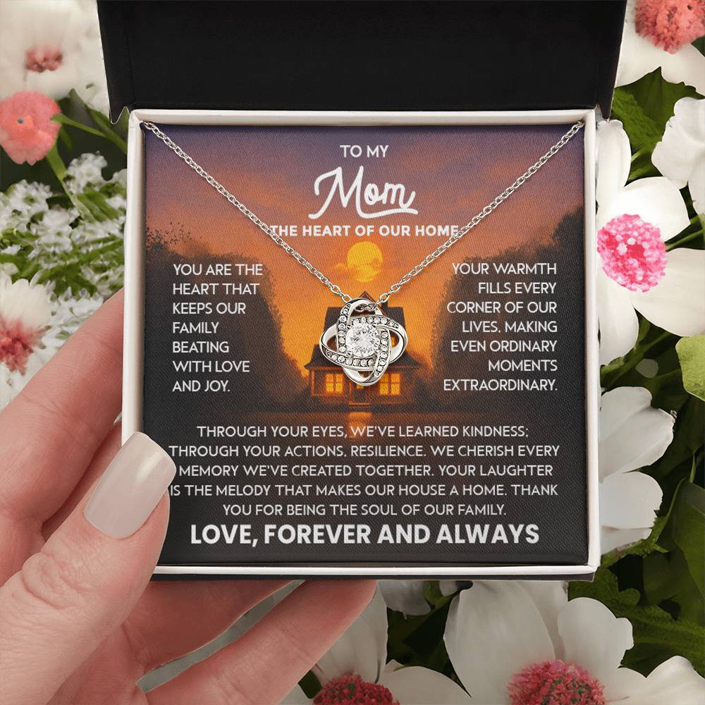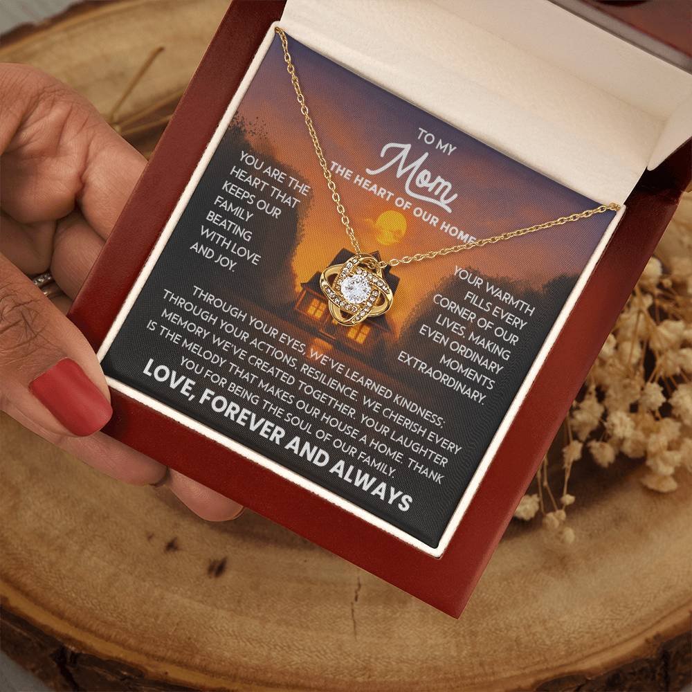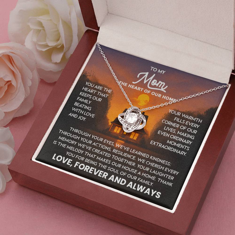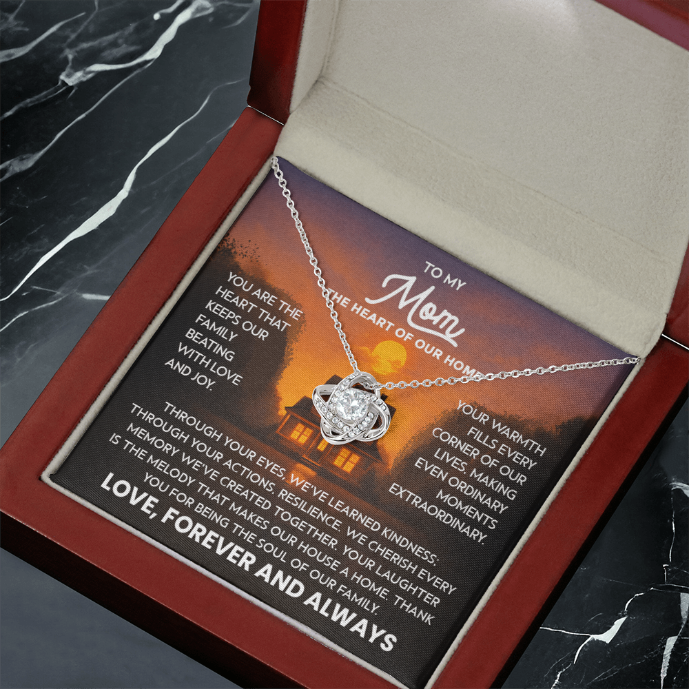 Mom Necklace for Women Stainless Steel, Mom Gifts for Birthday from Son, To My Mom the Heart of Our Home Message Card Jewelry with Love Knot Pendant